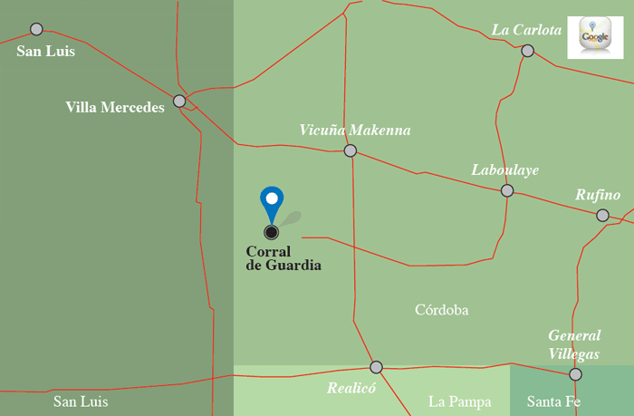 Corral de Guardia se encuentra ubicada a 15 km al noroeste de Villa Valeria Córdoba en el límite con la provincia de San Luis. El establecimiento cuenta con pista de aterrizaje de 1200 m de largo.